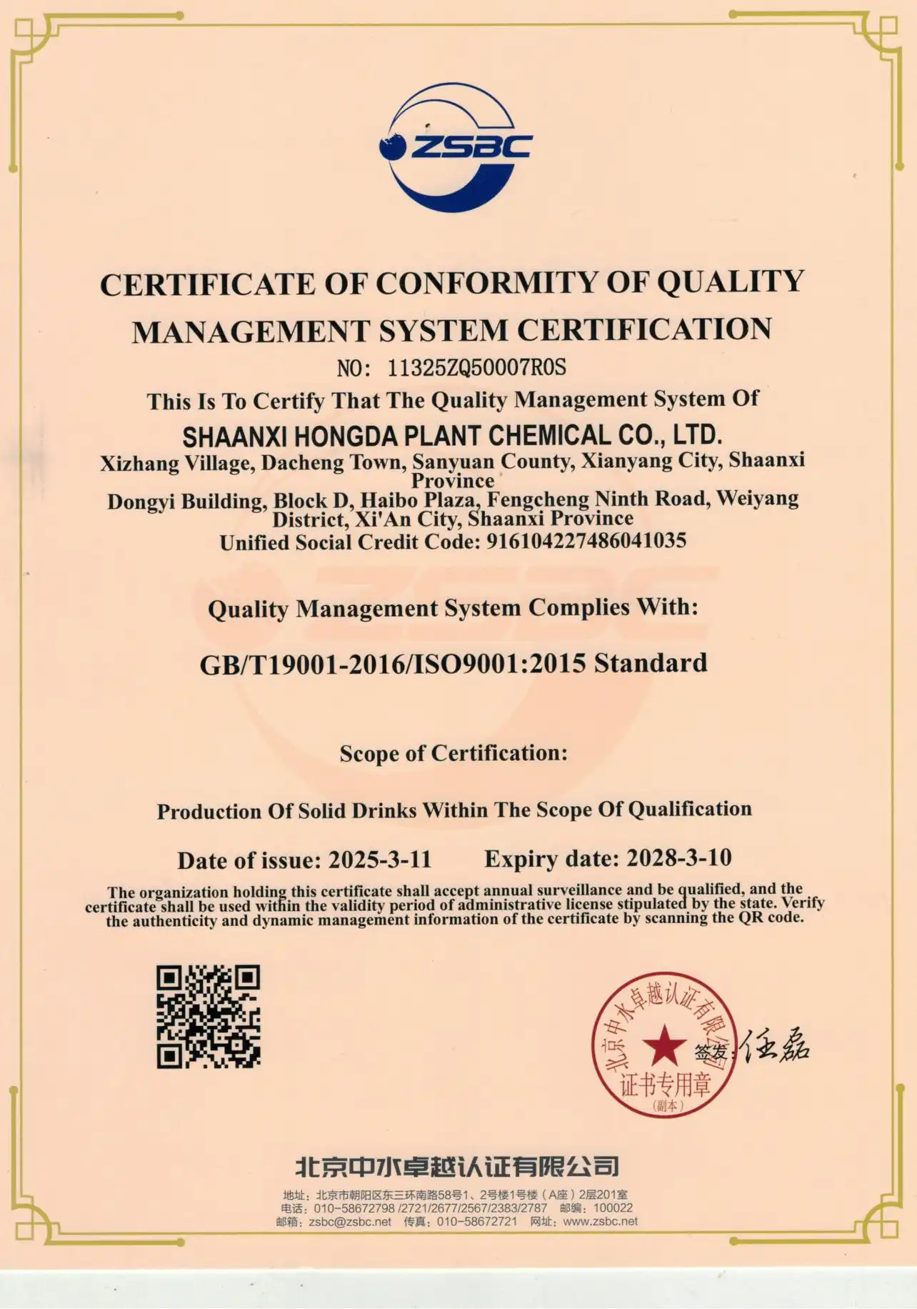 From 2001 to 2024, we have obtained national high-tech enterprises, food production licenses, feed additive production licenses, halal certification, kosher certification, BRC, FDA certification, organic certification and other certifications.